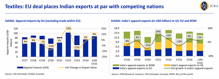 Indian textile and apparel exports are set to gain a significant competitive boost in the European market as the India–EU Free Trade Agreement (FTA) eliminates duties and places Indian shipments on a level playing field with key competitors such as Bangladesh and Vietnam, among other preferential trade partners, according to an ICRA report.