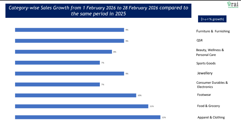 Retail sales in India recorded a 9% year-on-year growth in February 2026, reflecting a normalisation in consumption following a strong festive-led performance in November and December, according to the latest Retail Business Survey released by the Retailers Association of India (RAI).