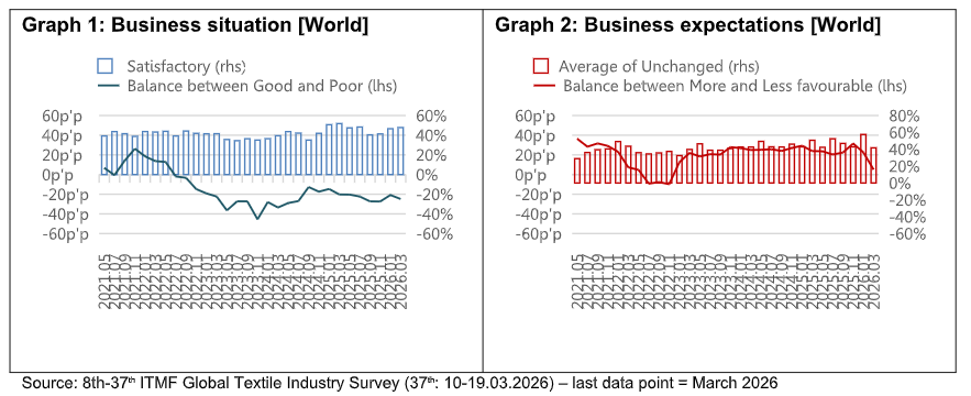 The 37th GTIS shows a deteriorating global business climate, with the global business situation balance falling to -25 percentage points as the US/Israel-Iran war disrupted energy markets. Africa was the only region posting a positive business situation and North & Central America recorded the steepest decline, while garment producers fared best among segments with textile machinery manufacturers remaining deeply negative.